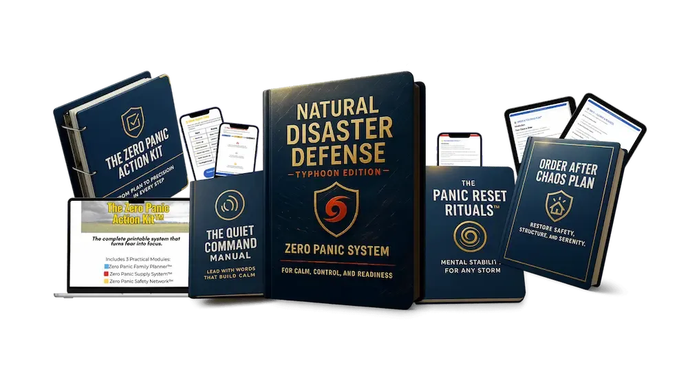 You’ll get the complete Zero Panic System™ Manual plus four professional bonuses — The Zero Panic Action Kit™, The Quiet Command Manual™, The Panic Reset Rituals™, and The Order After Chaos Plan™ — all designed to keep you calm, prepared, and coordinated during any typhoon.